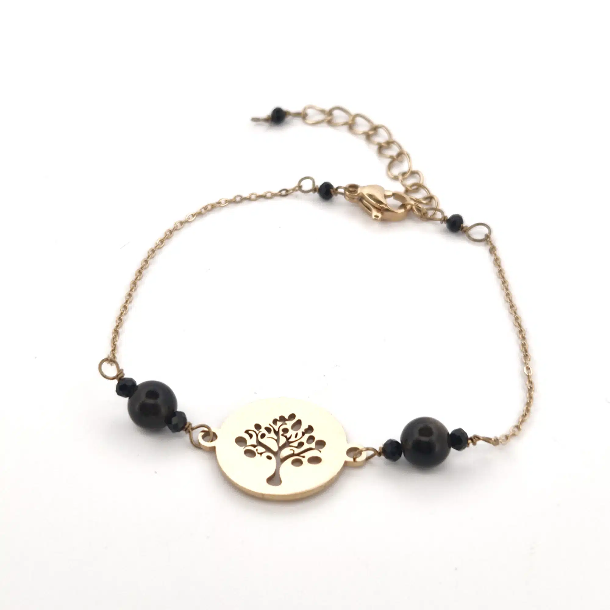 Bracelet arbre de vie en acier inoxydable & Obsidienne noire