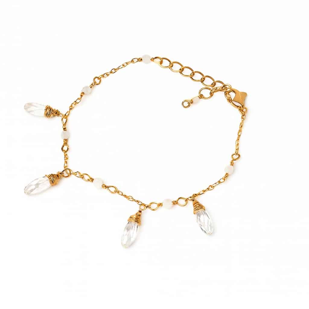 Élégance et raffinement s’invitent à votre poignet avec ce bracelet cristal de roche monté sur une chaîne dorée en acier inoxydable, sublimé par des éléments en laiton et des perles de verre délicates.