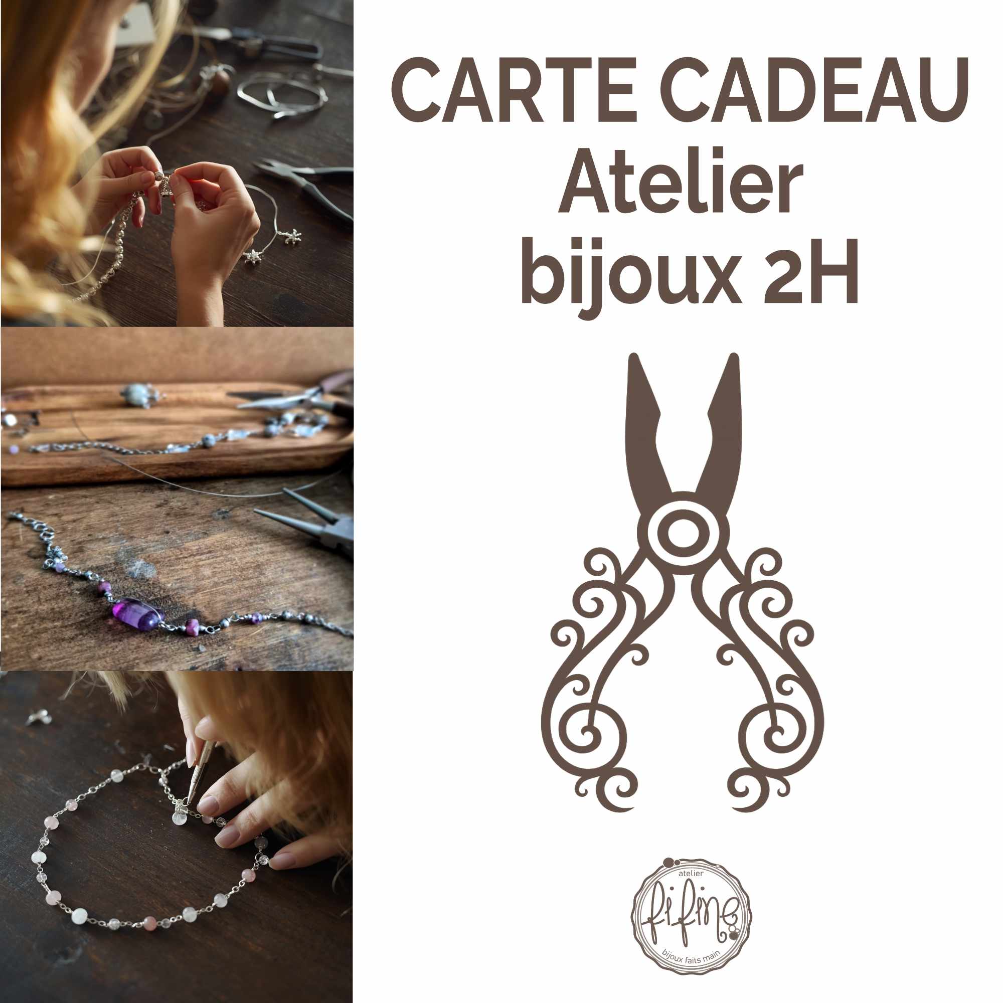 - Cette carte cadeau atelier bijoux correspond à un atelier de 2 heures (matériel inclus) sur les ateliers bracelet, ateliers collier et atelier boucles d’oreilles.